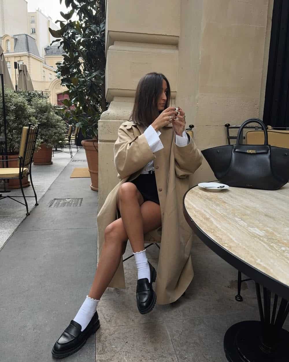 I love how Margaux put together an outfit that’s polished yet youthful. A crisp white button-up paired with a sleek black mini skirt feels playful but still works for a day at the office or at school. The chunky black loafers are the perfect shoe to pair with this outfit, while the ruffle top socks add just a touch of playfulness.