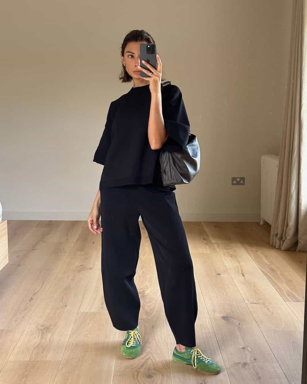 You can choose a black-on-black look like Marianna above, or opt for lighter tones like ivory or taupe. These pieces go together effortlessly, and while both the top and bottoms are ultra-casual, their simple design and structure keep the outfit looking sleek and chic.
