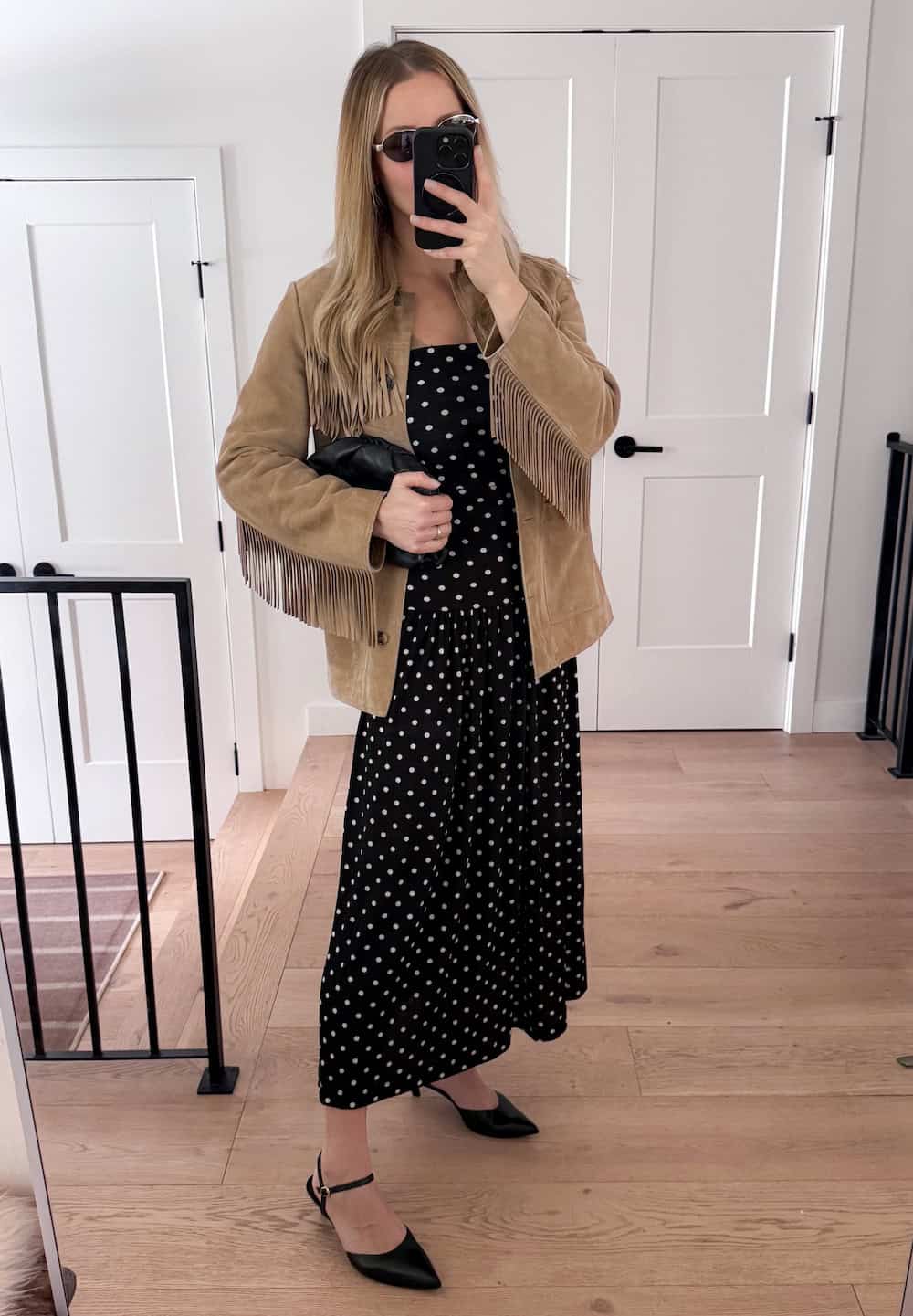 For a date night outfit in April, I reach for some of my favorite, playful pieces. A black-and-white polka dot dress is fun yet timeless, and the strappy black heels are a must for a classy look. And to add a modern, trendy touch, I finish the look with a fringed suede coat.