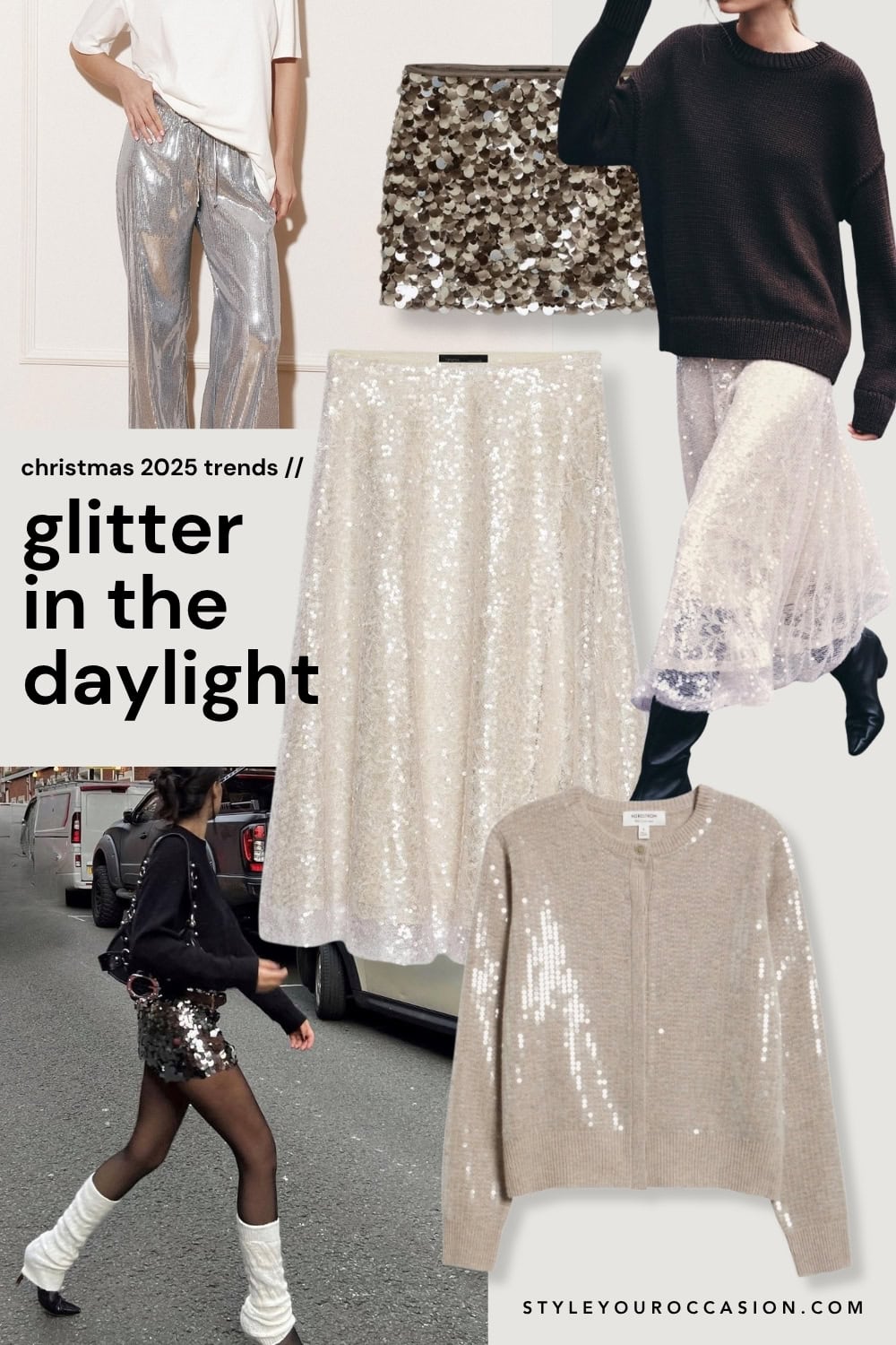This holiday season, let the sparkle slip into the daytime with sequinned skirts, metallic trousers, and crystal-embellished tops styled casually with knits and coats. TikTok creators are loving daytime sequins, showing how easy it is to ground a sequinned piece with more casual items for a coffee date or holiday shopping.