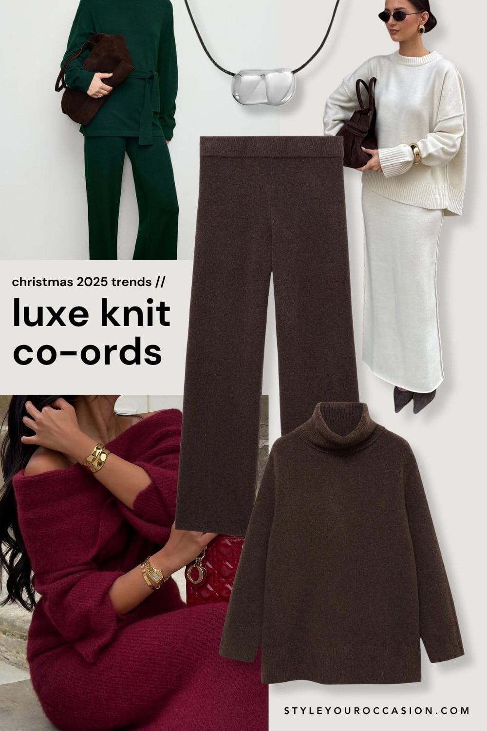 Opt for soft cardigans paired with matching skirts or wide-leg trousers that look polished but feel like loungewear. On IG, influencers are styling knit sets with heels and bold jewelry for gatherings, proving that cozy can absolutely be elegant.