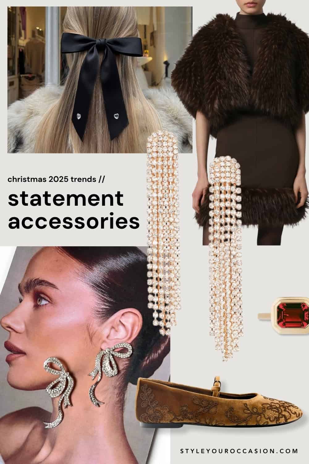 Think giant bows, faux fur shrugs over your party dress, or chandelier earrings that sparkle in every photo. Pinterest is already full of flatlays featuring statement accessories styled for holiday parties.