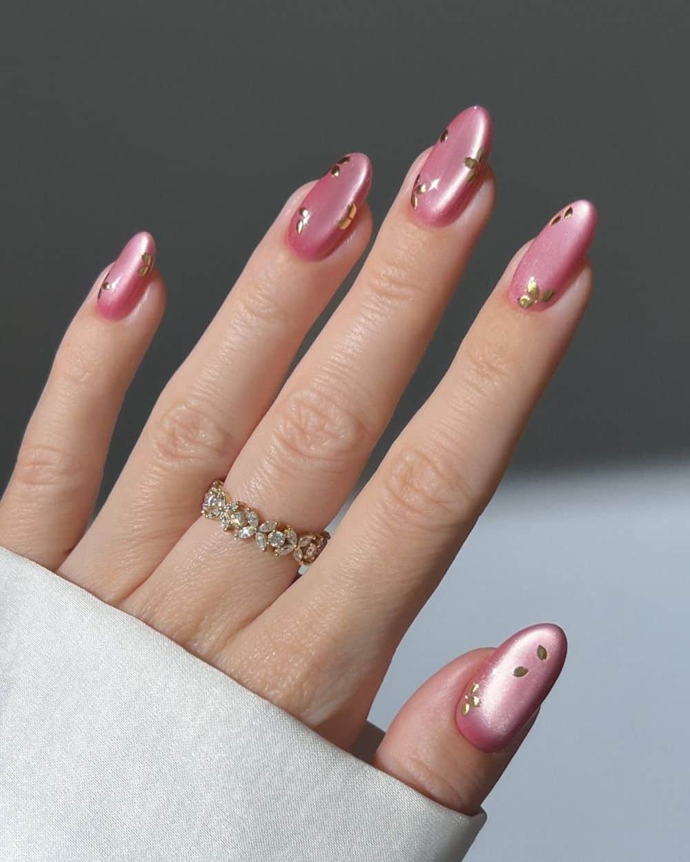 A pink velvet mani is always stunning, and Aisté leveled these nails up with gold botanical details. Choose a lighter pink tone and keep the gold accents minimal to make this design alluring and elegant without going overboard!