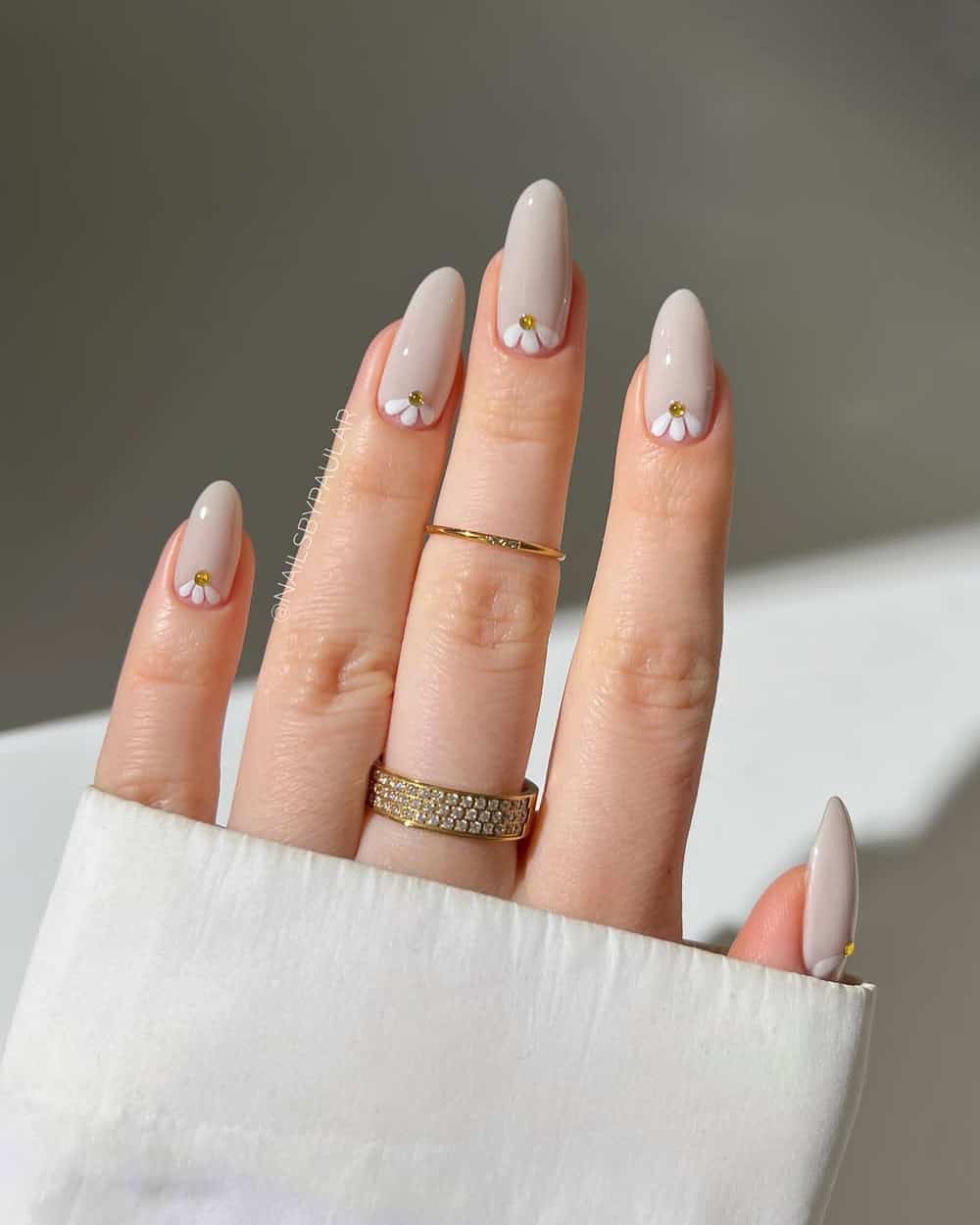 For the girlies who love to go neutral all day, every day, use a soft, beige base color and add ivory peek-a-boo flowers for something spring-inspired but classic. I love how Paula has added golden crystals to each flower for an elegant 3D detail.