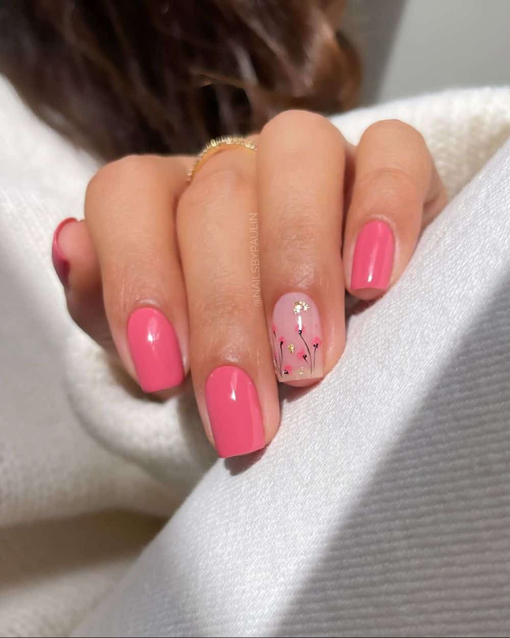 A beautiful pink nail polish is a must-try for adorable and classy spring nail ideas! I love how Paulina paired this hue with a floral accent nail. It works perfectly to contrast the vibrant pink and lend a seasonal finish to the design.