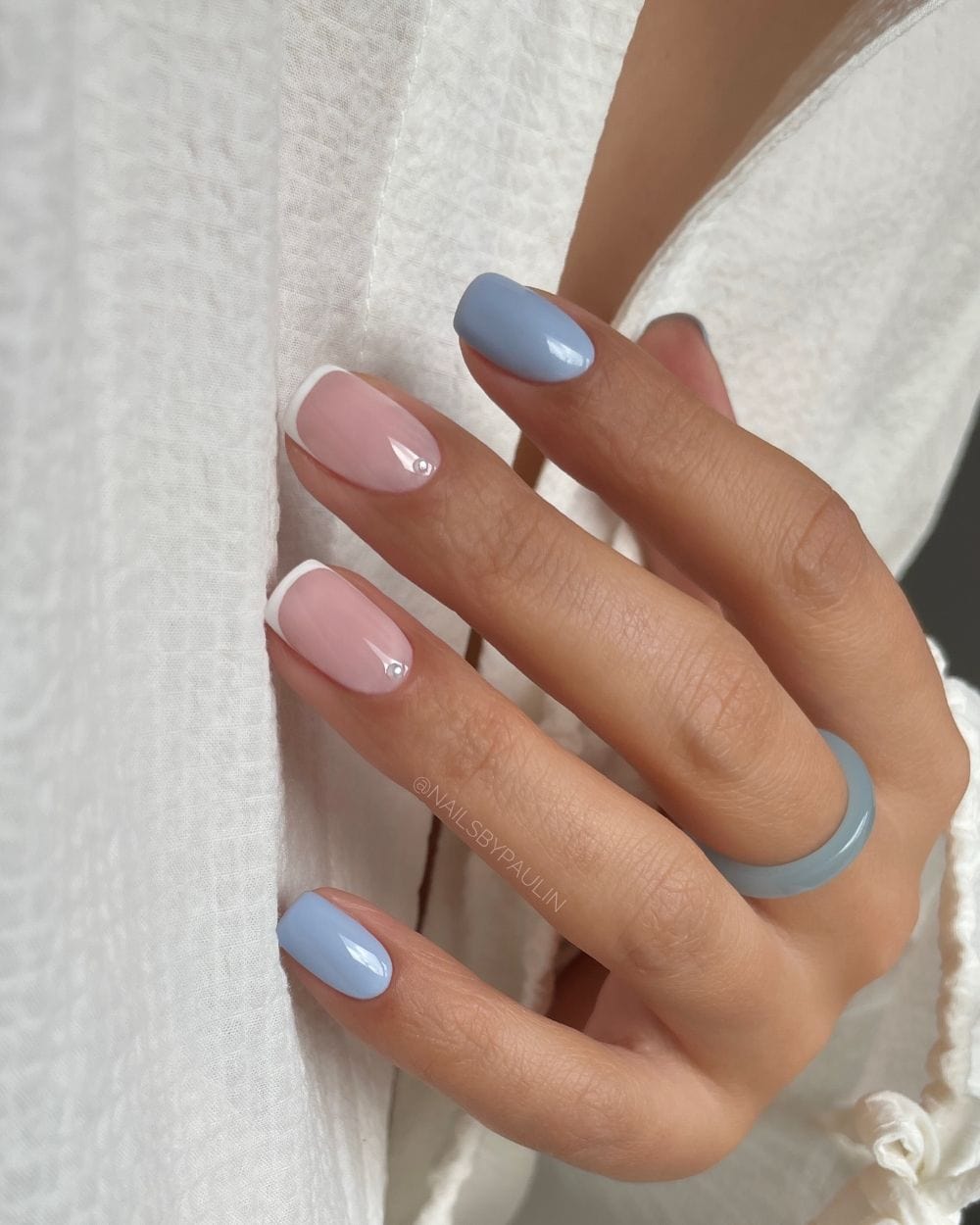 A powdery blue paired with dainty pearls is perfect for something understated but elegant. Add more or bigger pearls for something that makes more of a statement or keep it as is for a simpler look.