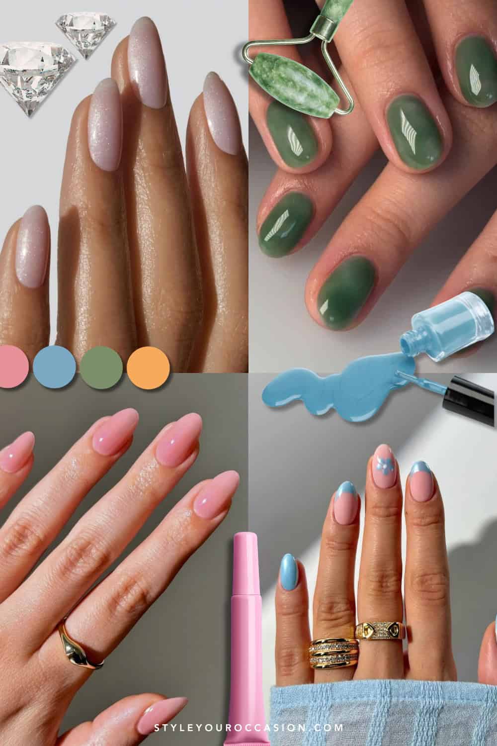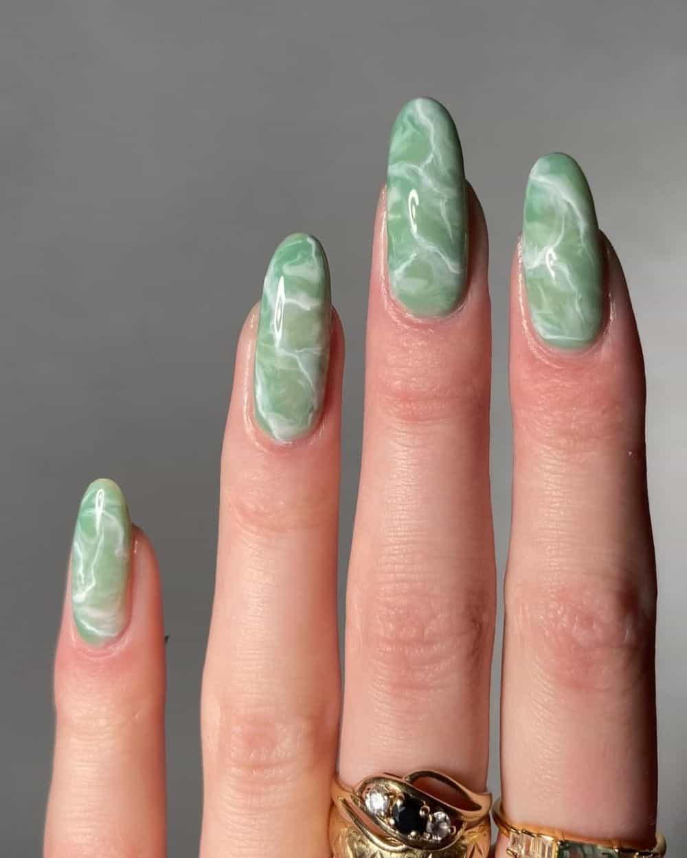 So, it almost goes without saying that the top look to sport with jade nail polish in 2026 will be a gorgeous, marbled look like the one on the left. But really, any manicure in this shade is perfect for a fresh, organic aesthetic. And like the blue French tip trend on this list, this hue looks gorgeous with any color scheme.