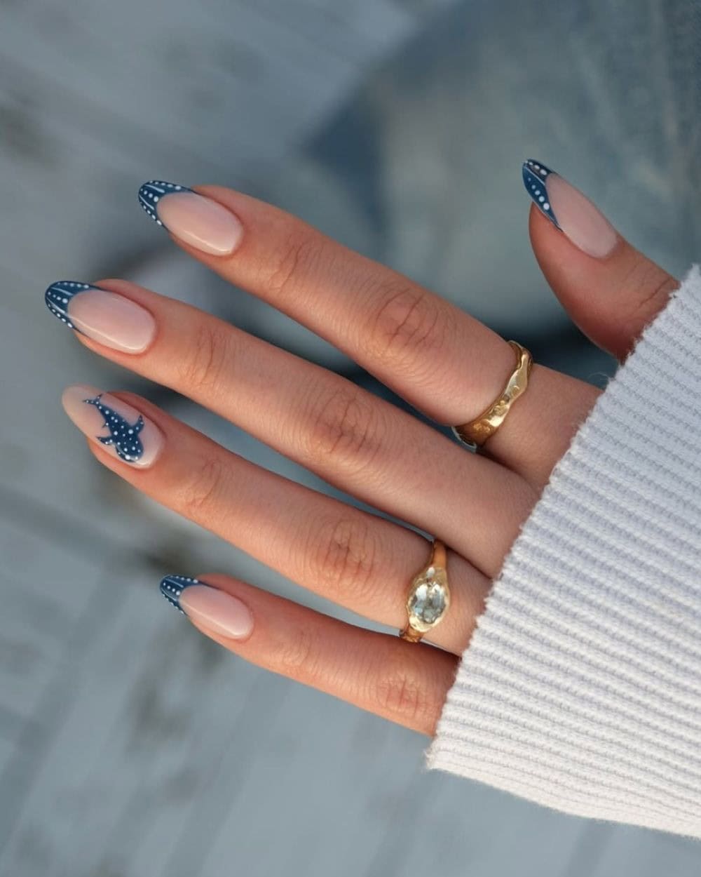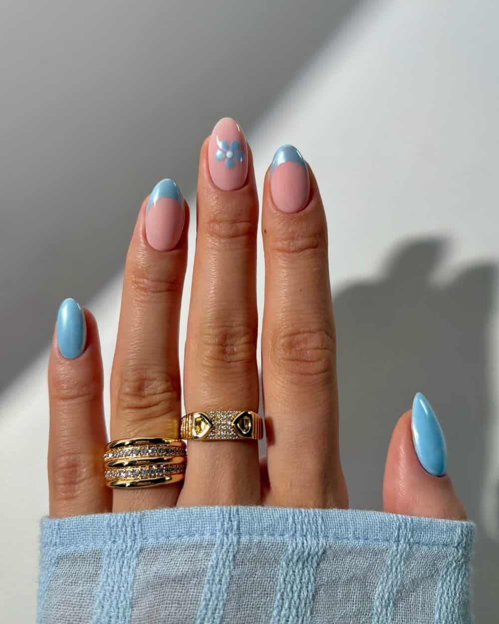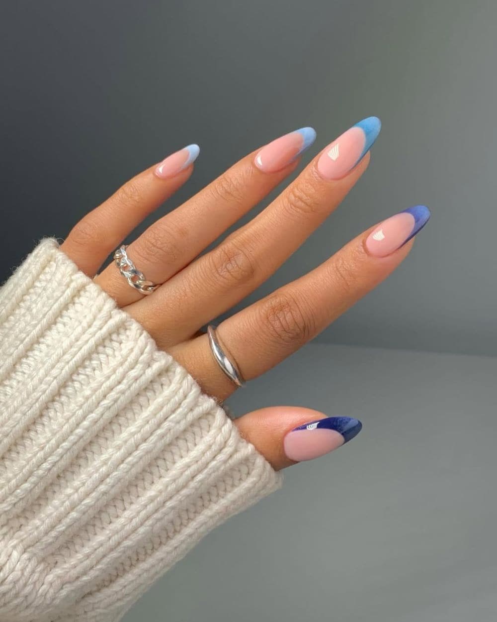 From sky blue to navy tones, there’s no wrong way to rock this trend, and you can also pair this color with any number of designs, embellishments, and topcoats. A pastel blue with chrome and florals? Yes, please! Deep ocean blue with marine animal print? Stunning! Or you can go for something simple and charming, like an ombre blue French (love this look on Cerise’s long almond nails).