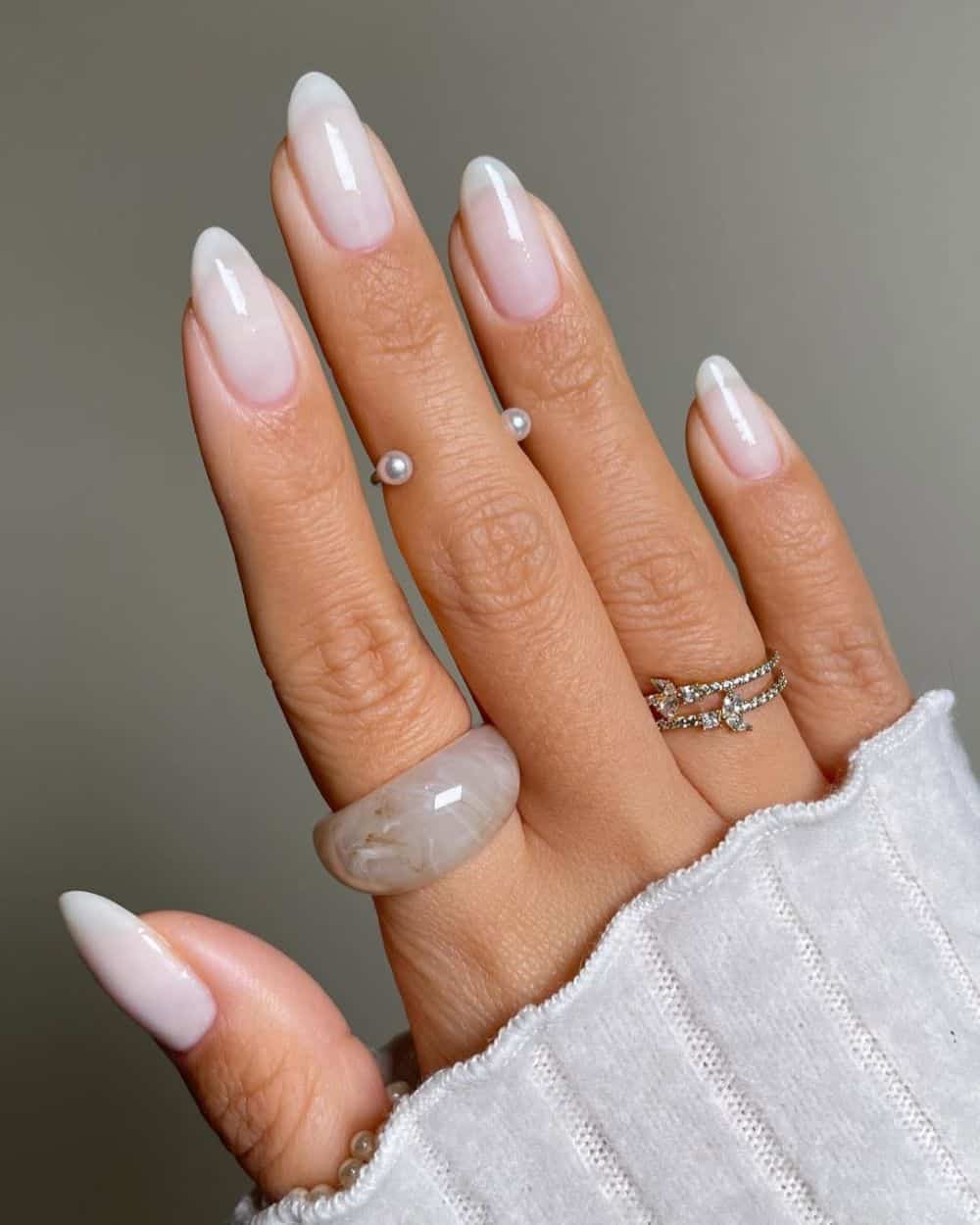 This hue is another fantastic pick for a quiet luxury look this summer, but it still feels airy and playful enough to match the season’s vibe. A semi-sheer coat of ivory ocean foam is chic and effortless. To play around with this one, use solid white tips with a foamy base (see @samantharudgebeauty for inspo), or pair hazy white tips with a warm, sandy beige base as a subtle nod to the sea.