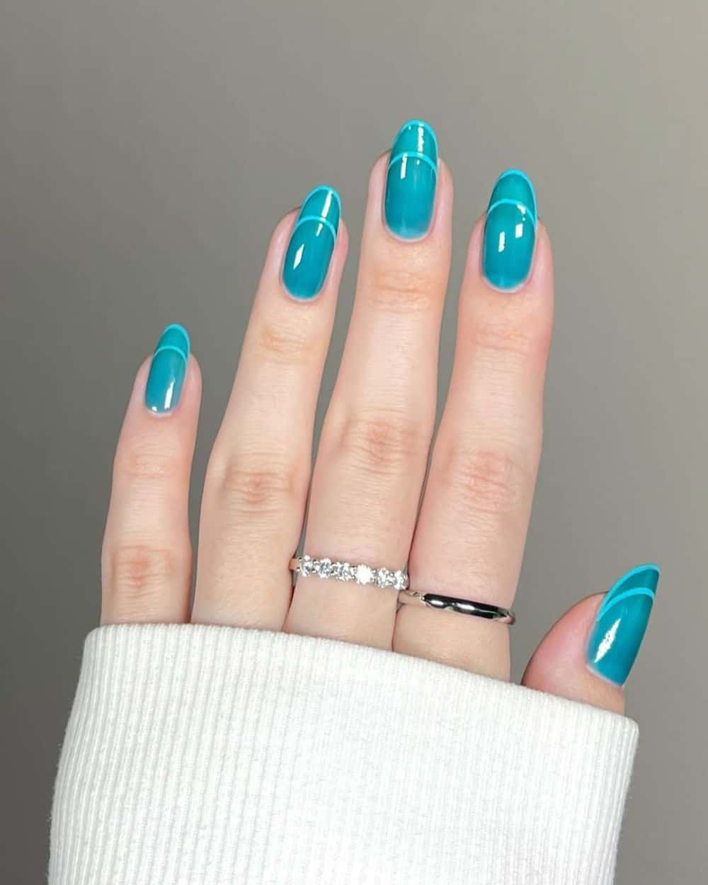 So, bright, electric teal is making waves for June 2026, and I love Kalnina’s idea of a shimmery finish. ILNP Cosmetics has the perfect example of this. I love how this look has even more of a summertime vibe than classic glossy nails. If you don’t want to dive headfirst into this trend, opt for something more subtle, like the gorgeous teal Frenchies by @arfinails.