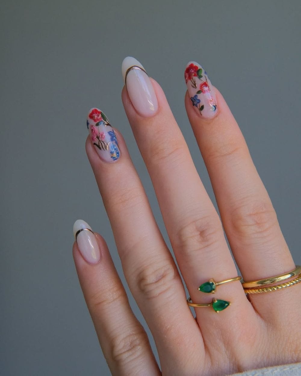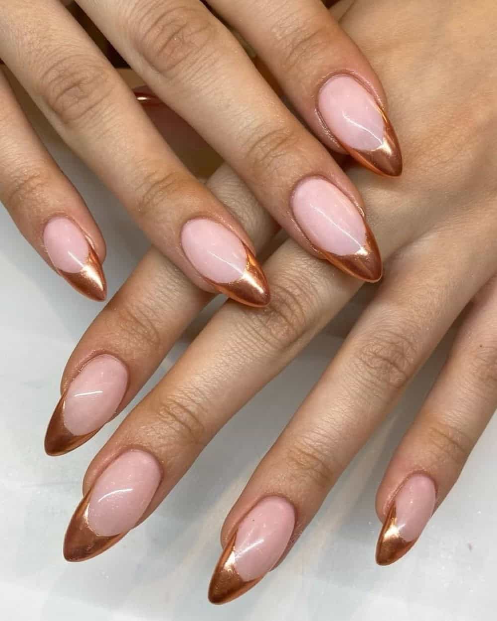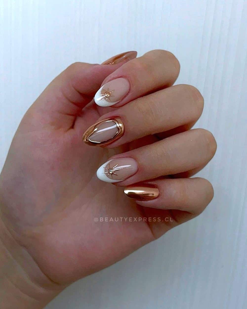 I’m drooling over the spring-inspired look by Amber on the left. She pairs vibrant florals and dainty copper lines perfectly! But if you want something that is a little simpler and more versatile, add simple pops of chrome to nude nails via French tips, molten details, or accent nails.