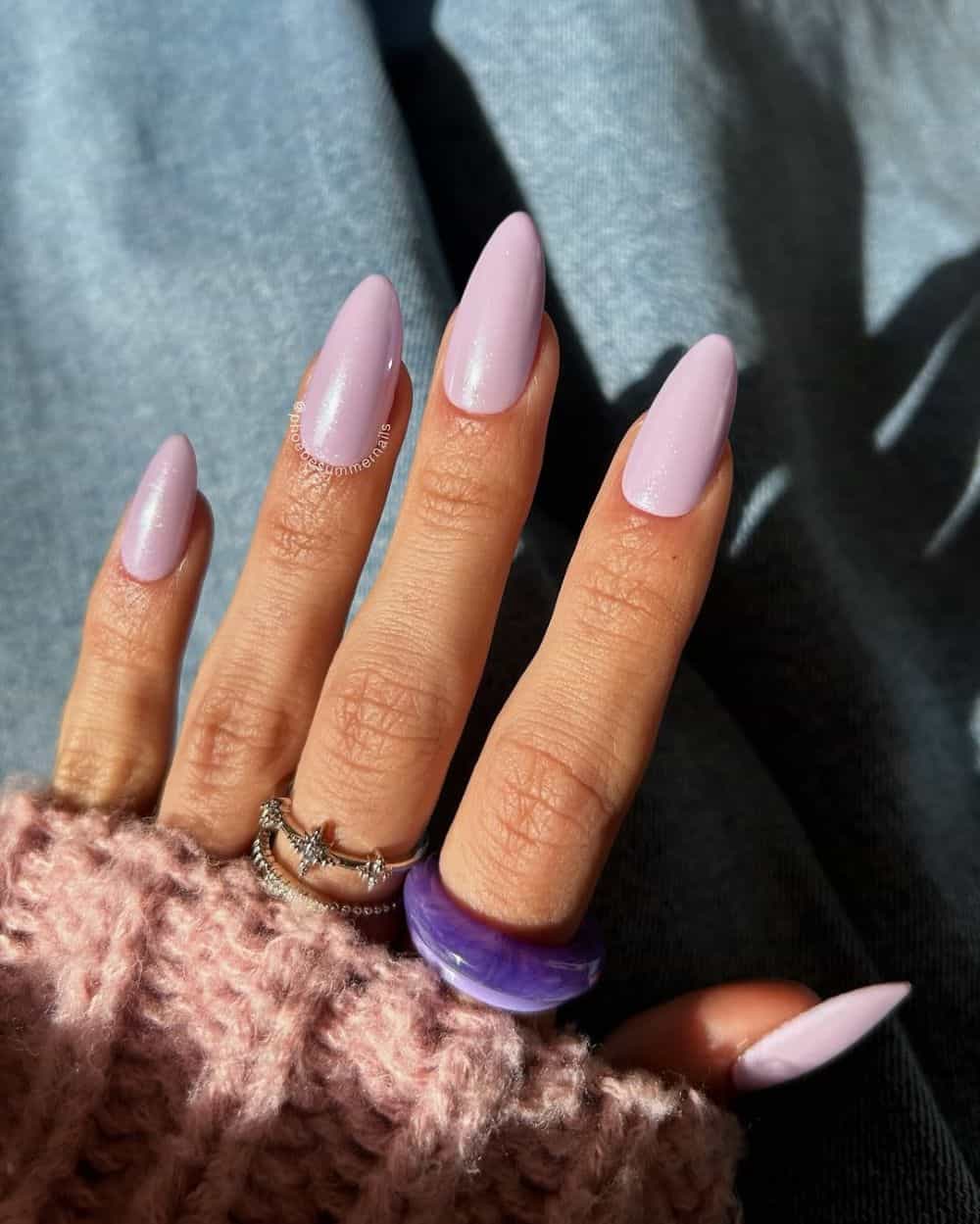 Add a soft shimmer to recreate the look by @phoebesummernails, pair this lilac tone with gold accents and floral art for a look similar to @framenails, or keep it short and sweet as @m.o.n.a.j did!