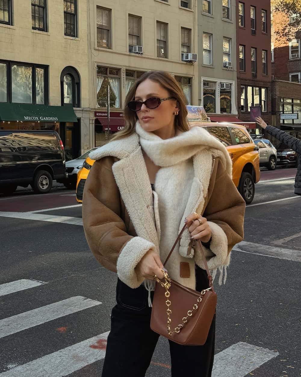 While the look is very on-trend, what I love most is how practical it is. A warm shearling jacket is one of those pieces New York fashion girls reach for again and again because it looks elevated while actually keeping you warm against the wind tunnels that happen between the buildings. Pair it with straight leg jeans, simple heeled boots, and a chic brown bag to tie the look together.