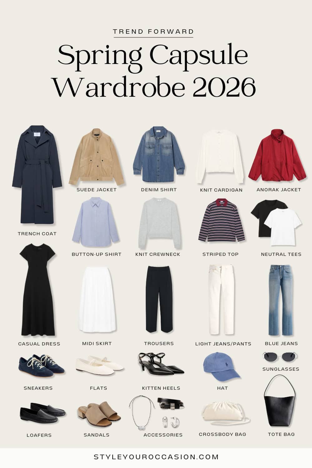To keep things simple, I’ve laid out every item I’ve included in my 2026 spring capsules — piece by piece.