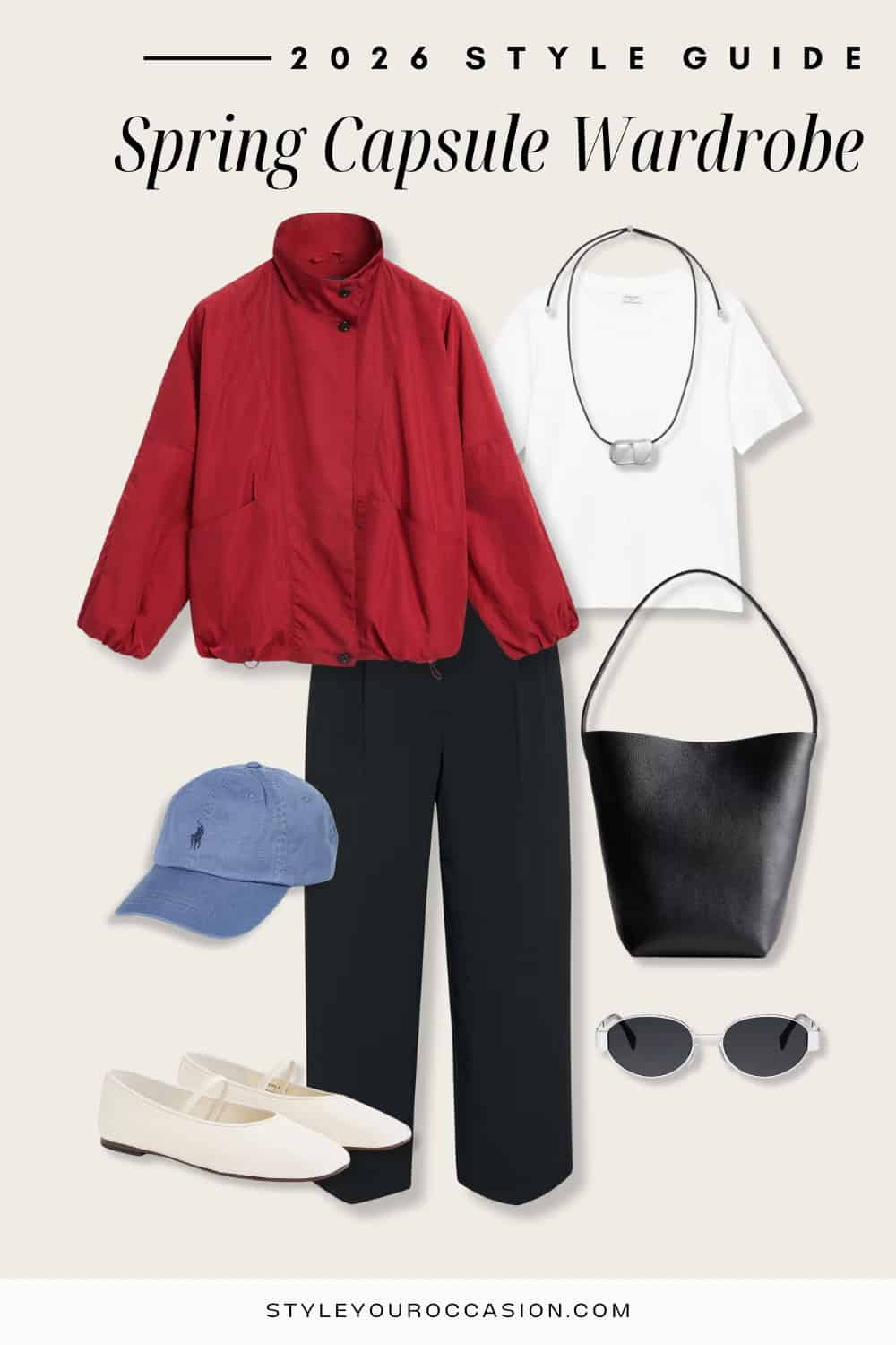 A sporty jacket is a practical but on-trend addition to a spring capsule for 2026, with windbreakers, anoraks, and lightweight utility styles continuing to have a moment. This category of outerwear brings an effortless, sporty edge to everyday outfits while still being incredibly useful for unpredictable spring weather. For my neutral/timeless capsule, I kept it classic with a simple black option (this is a very similar one for less than $100!) that pairs seamlessly with everything, and for the trend-forward capsule, went with a pop of color—with this red jacket from Massimo Dutti—to instantly energize the capsule and give even the most minimal looks a modern, cool-girl vibe.