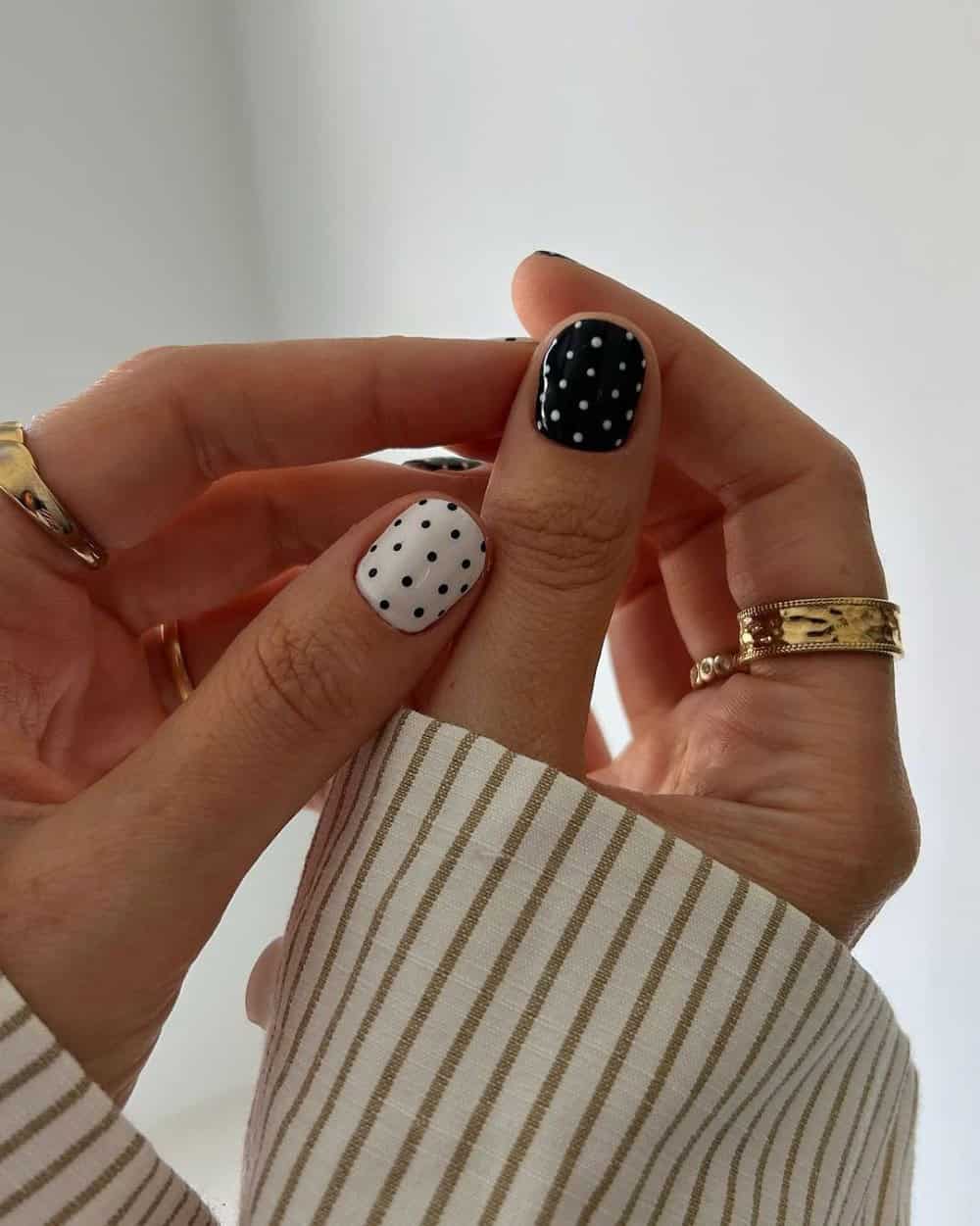 There are endless design possibilities with this color pairing, and you can lean into the white for a bright and refreshing spring look or go heavier on black polish for a dark, bold, and unexpected design. Black-and-white florals, like the ones above by @brittany_nailart, couldn’t be a better pick for neutral spring nails, while the other designs are ideal for simpler, day-to-day looks.